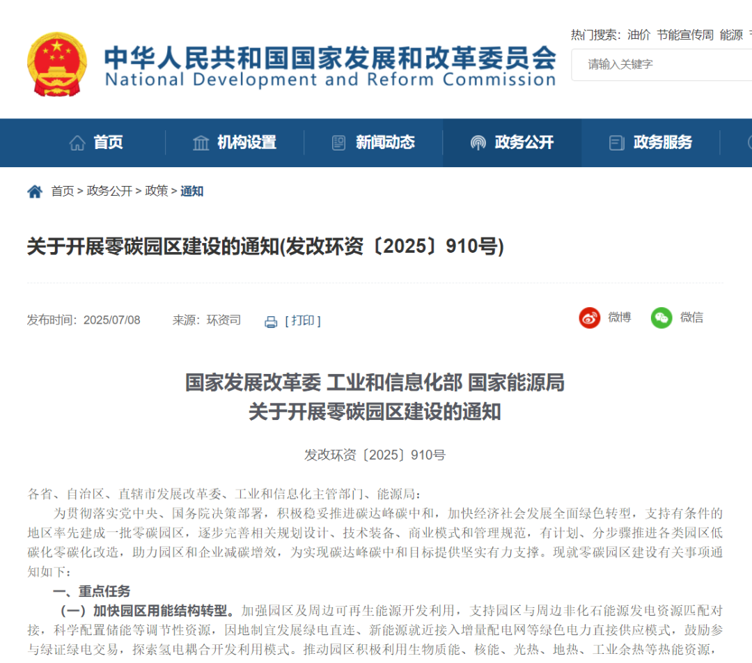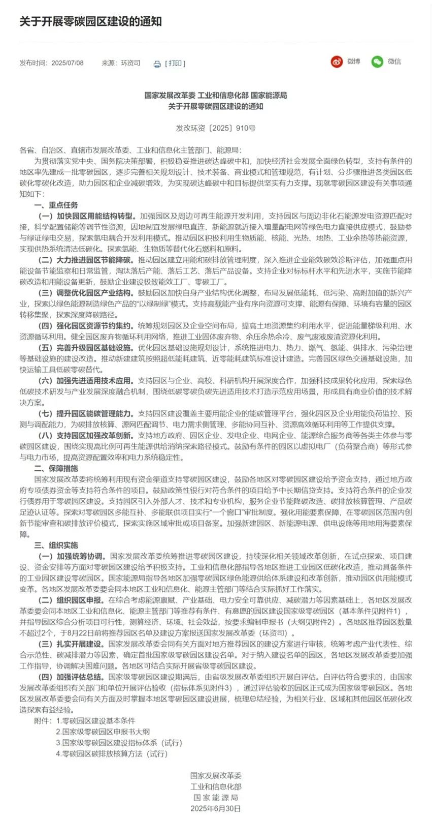 国家发展改革委、工业和信息化部、国家能源局近日印发关于开展零碳园区建设的通知,支持有条件的地区率先建成一批零碳园区,逐步完善相关规划设计、技术装备、商业模式和管理规范,有计划、分步骤推进各类园区低碳化零碳化改造,助力园区和企业减碳增效。